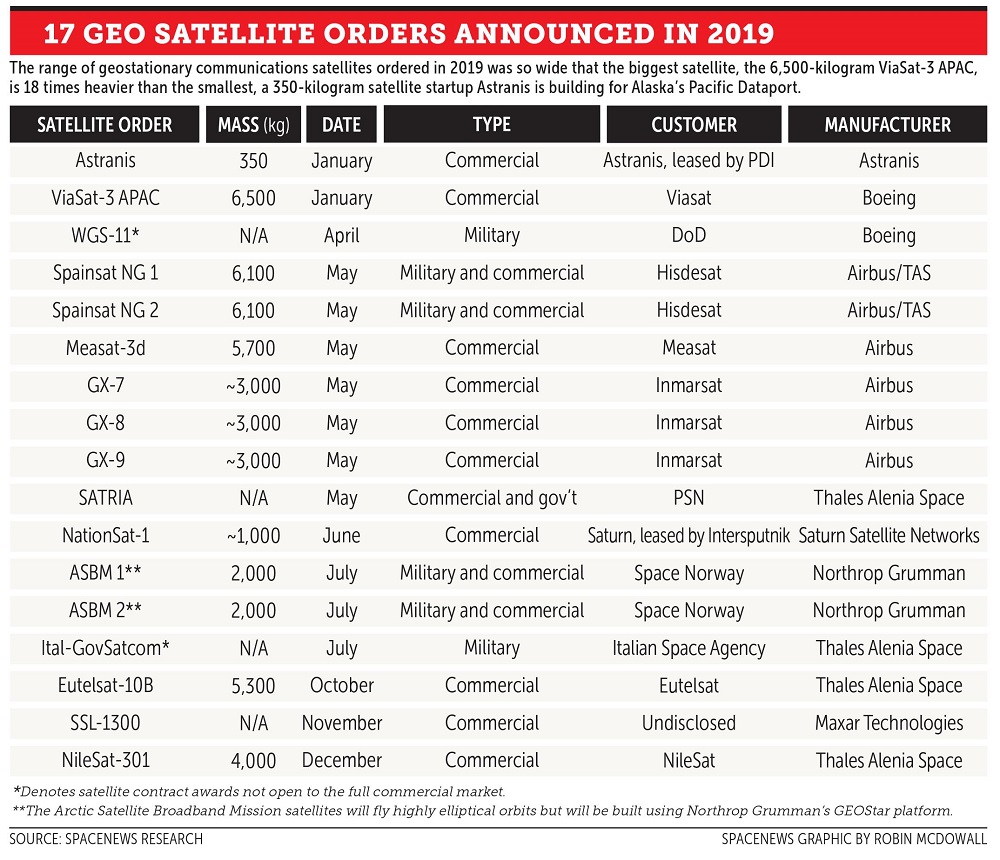 Satellites ordered in 2019 ranged from the 350-kilogram small GEO satellite Astranis booked in January, to the heavyweight 6,500-kilogram very high-throughput ViaSat-3 Asia-Pacific satellite that Boeing booked around the same time.
